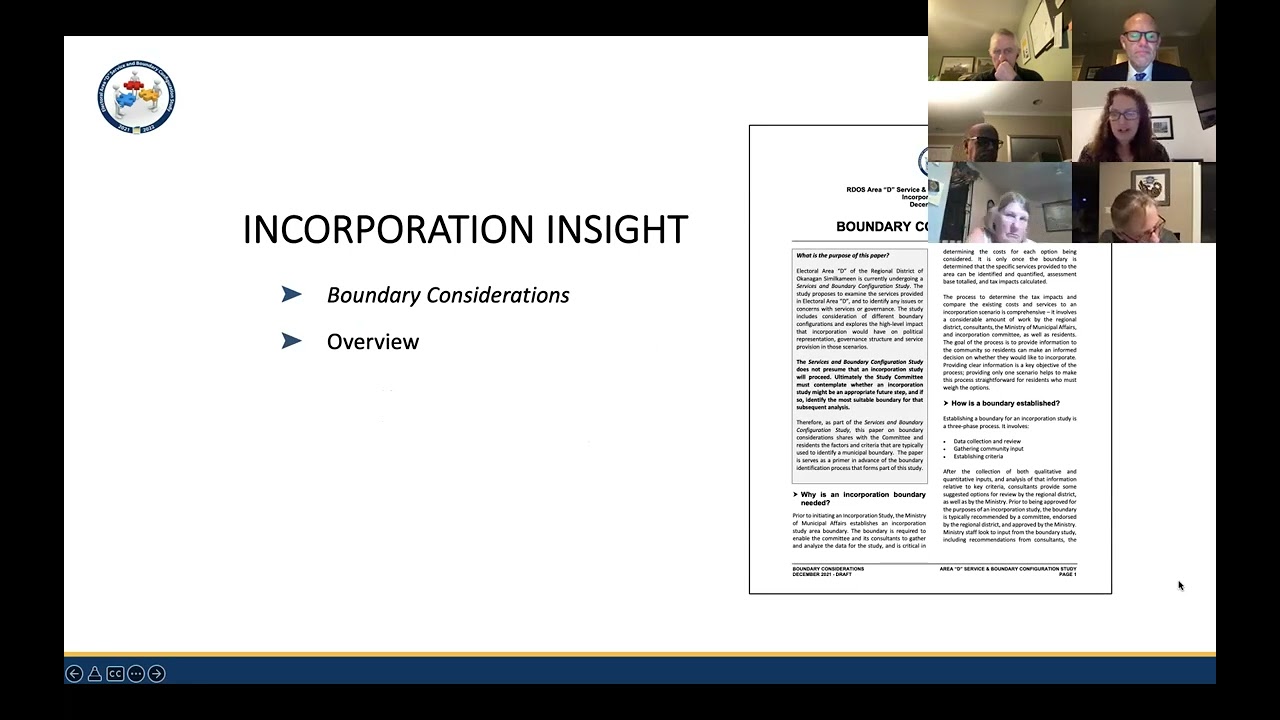 The Regional District of Okanagan-Similkameen (RDOS) is undertaking an analysis in Electoral Area "D" communities on services and opinions on incorporation, as well as discussions on potential boundary configuration options in the Electoral Area. The purpose of the study is to conduct an analysis and work to develop and test potential municipal boundary configurations in Electoral Area "D".