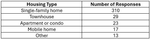 - Most respondents live in single-family homes, but many housing types were represented in the responses.